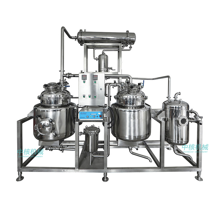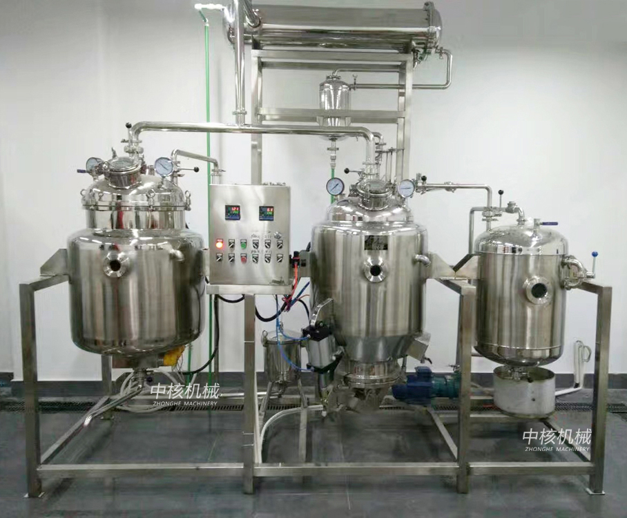 2. 本設(shè)備可采用真空低溫提取,有效減少熱敏性有效成分的喪失。提取罐內(nèi)配有雙級攪拌,使體積比較大的物料充分與溶劑接觸,加速有效成分的析出。